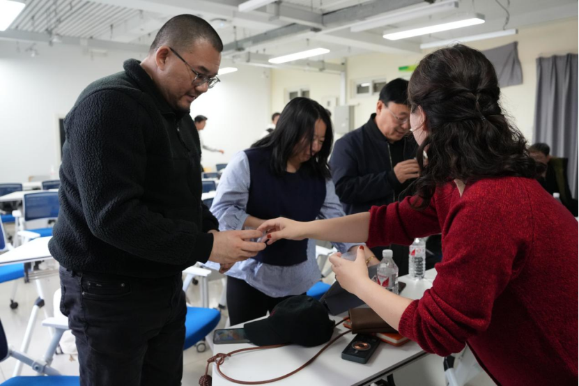 评委团队由学院领导、专业教师和行业专家组成,他们认真听取了每个小组的汇报,分头参观并体验了各组同学的装置作品,对各个小组的作品进行了点评,提供了宝贵的建议。此次评分不同于以往的评图流程,每个评委们手中都持有一定数量可点亮的“小灯泡”,他们根据每个小组作品的互动体验将灯泡放在心仪的作品上点亮。这种新颖的评分方式不仅增加了活动的趣味性,也激发了同学们的参与热情。