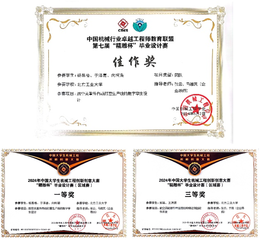 智能制造项目共3项团体作品成功参赛,在北部赛区区域赛阶段荣获北部赛区区域赛一等奖1项、三等奖1项;在全国赛阶段,企业导师马维民和校内导师张云指导学生杨易格、于泽嘉、向柯潮所做毕业设计作品荣获全国赛优秀佳作奖。