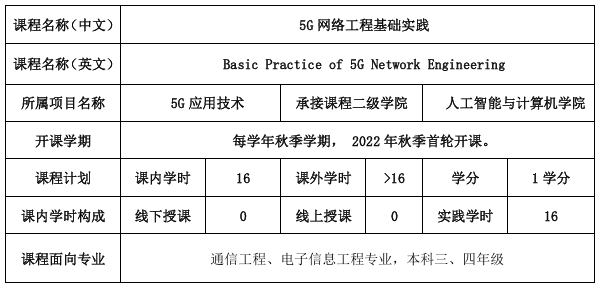 5G网络工程基础实训》课程共计16课时,是一门强调实践性的课程。本课程采用工程项目实践教学方式,让学生深入掌握理解5G理论及工程应用技术。