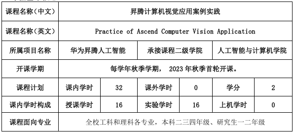 本课程为产业技术类课程,依托华为昇腾AI全栈技术平台,系统讲授深度学习基础技术(包括卷积神经网络、生成对抗网络等)在计算机视觉核心任务(图像分类、目标检测、图像分割、图像生成)中的应用,并涵盖Vision Transformer、扩散模型等大模型技术在计算机视觉中的前沿实践。课程采用“理论+实践”的教学模式,通过基于昇腾开发板的实战项目,帮助学生深入掌握MindSpore框架应用开发、模型转换与端侧部署等关键技术。课程聚焦产业实际需求,致力于培养学生基于昇腾平台实现计算机视觉项目全流程开发与落地的能力,为其胜任人工智能算法工程师、深度学习工程师、图像算法工程师等岗位奠定坚实基础。